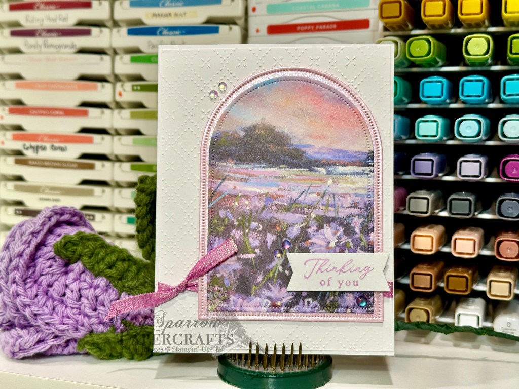 We get started with a simple base of white cardstock. The background panel is a quarter sheet of white cardstock that’s embossed with the Beautiful Pattern embossing folder. The focal panel is cut from a sheet of the Splendid Autumn paper pack using the Everyday Arches dies and then matted with some pastel pink shimmer paper cut into an arch just a tick bigger. The embossed backdrop is wrapped with some Petunia Pop iridescent ribbon and then adhered to the card base. And then the focal panel is adhered just slightly off-set on top with dimensionals. The sentiment from the stamp set included in the 2025 Advent Calendar is stamped in Fresh Freesia on one of the smaller banner dies from the More Messages set and then adhered with dimensionals onto to the bottom-right corner of the focal panel. A few frosted iridescent dots finish things off with a hint of twinkle.