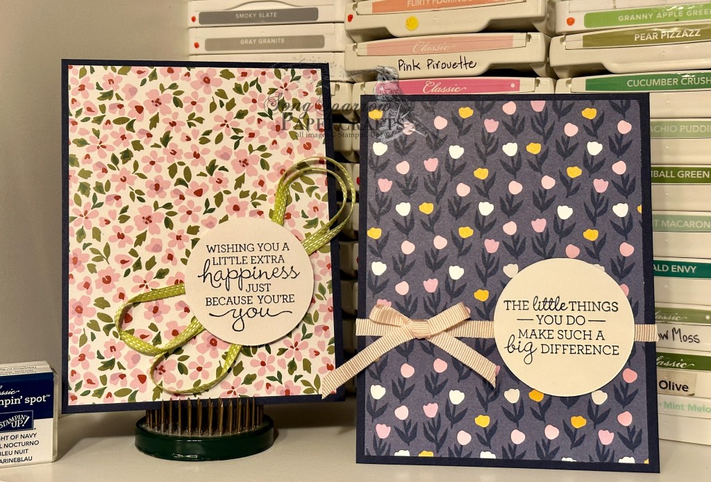 Each card design consists of Night of Navy as the card base. A different pattern of the Delightfully Eclectic designer paper is mounted on each base. The sentiments are stamped in Night of Navy on Basic White cardstock using the Pansy Patch stamp set. And each card is embellished with ribbon.