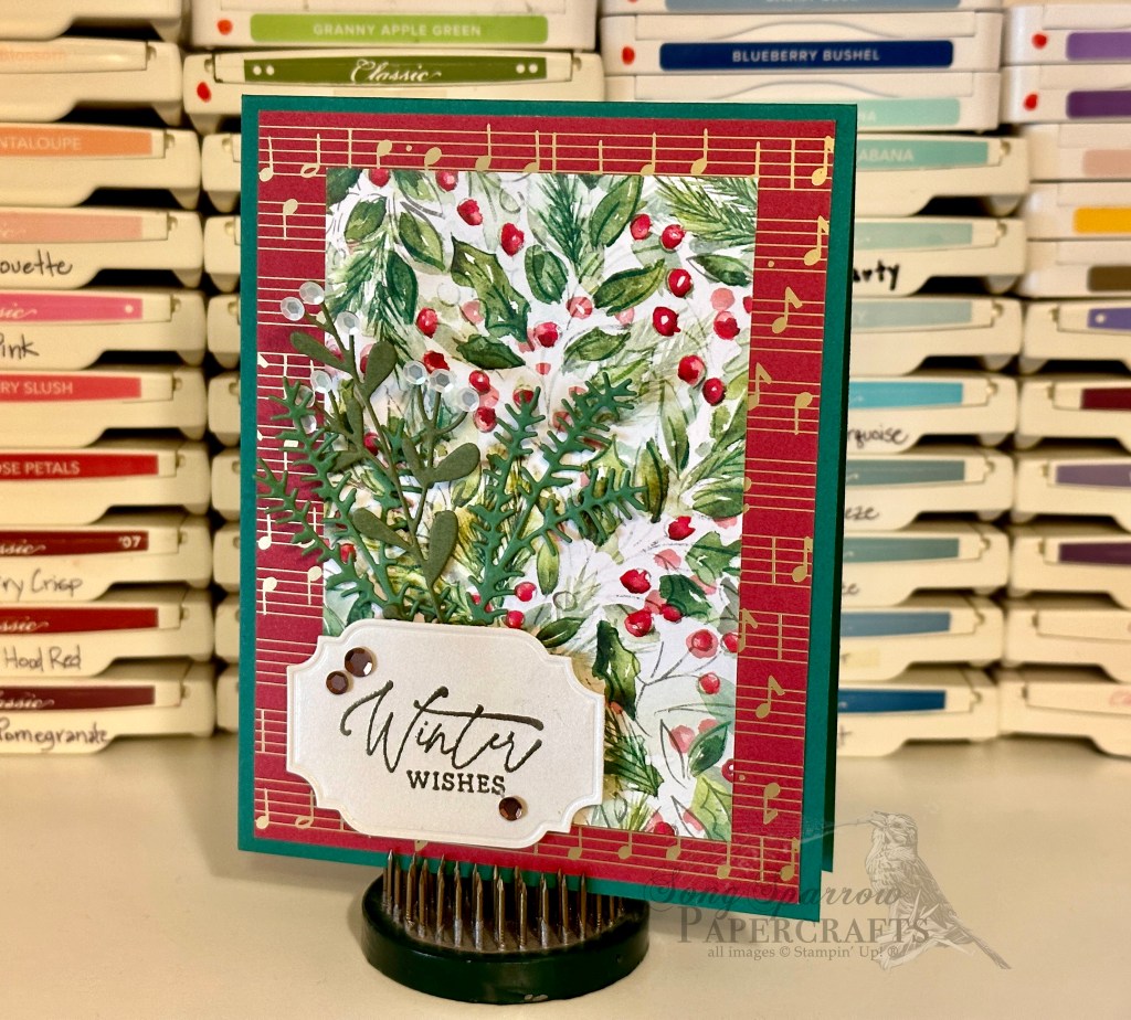 Today’s card design features a beautiful sheet of foiled sheet music which is part of the new Joyful designer series paper pack from the Stampin’ Up! Holiday Mini catalog. It serves as the perfect backdrop for the lovely holiday greenery paper. To add depth to the design, I added fresh cut greenery behind the sentiment panel.