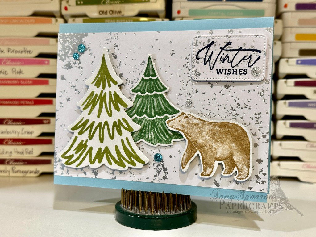 I wanted to make a super simple snowy scene, so I diecut a few trees and punched the bear from a sheet of A Walk in the Forest and gave layers to the scene with varying heights of dimensionals. I used a sheet of the Snowflake Magic specialty paper as the snowy background and put it all atop a card base of Balmy Blue. The sentiment is heat embossed for a little extra pop. Super simple design with a lot of pizzazz!