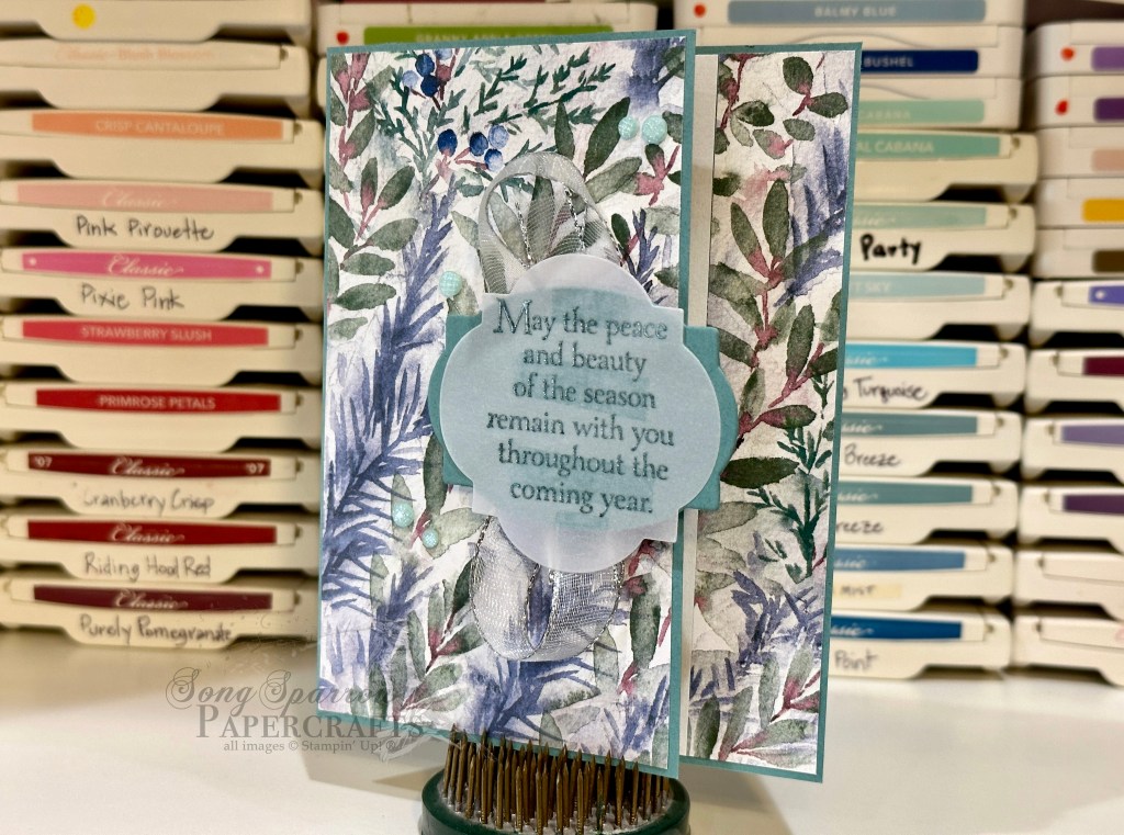 Have you enjoyed the sneak peek at the Magical Meadow designer series paper that launched this week in Stampin’ Up!’s Holiday Mini catalog? These watercolor designs are beautiful. Today’s focal pattern from the paper pack is one of those sheets of designer paper that you almost hate to cut! But with just the right design, you can showcase those really stunning sheets of designer paper and not feel quite so guilty about cutting them up.