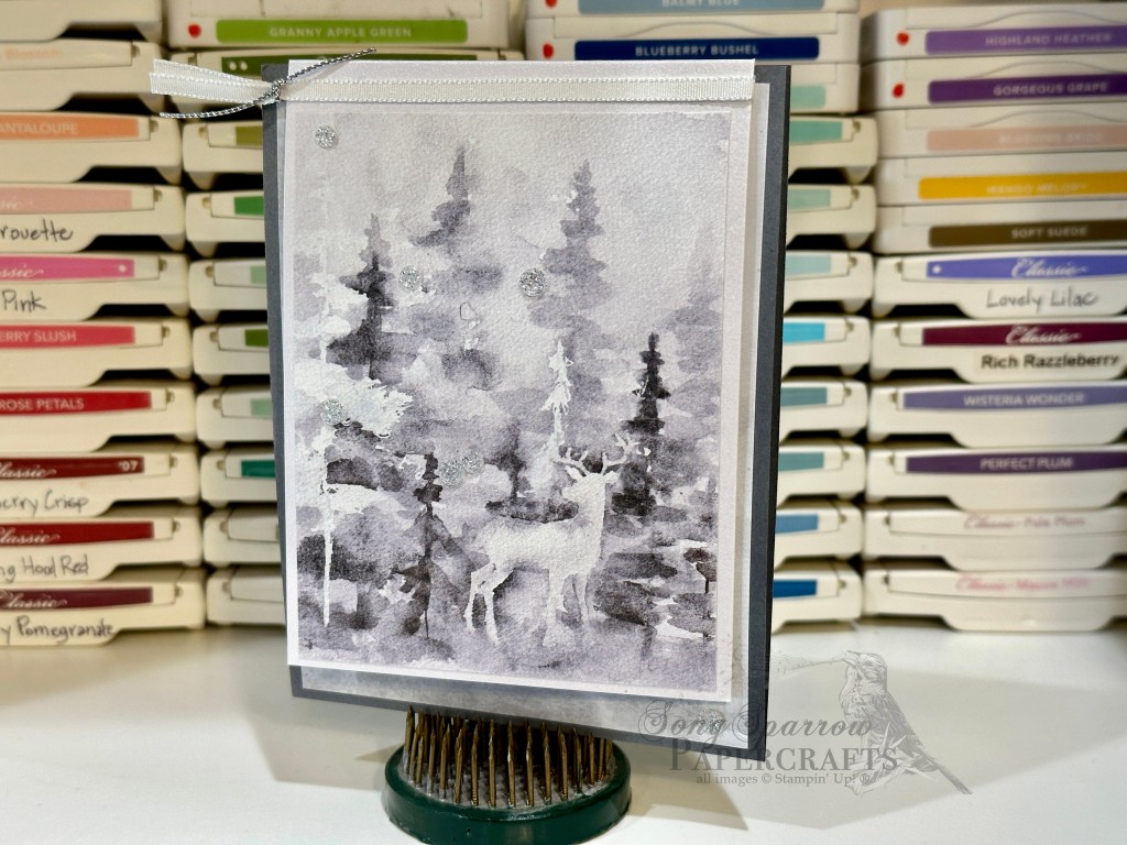 If you have followed me for the last month or so, you probably will recall that I have mentioned how much I love the Winter Meadow designer series paper that Stampin’ Up! just launched in its Holiday Mini catalog. And you may have heard me talk about how much I love this particular sheet of paper from that paper pack. I come from a family of avid hunters, so I’m always drawn to well-designed craft products that lend themselves well to documenting a hunt or simply the majesty of wildlife.