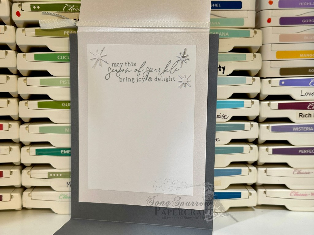 When you flip down the center panel, you reveal the inside of the card. Since this section is intended for a message to your card recipient, it’s very simple with just a sentiment panel over the shimmer white cardstock. I added a few stars diecut from a sheet of the Snowflake Magic designer paper for a little visual interest and to carry the snow theme through to the inside message panel.