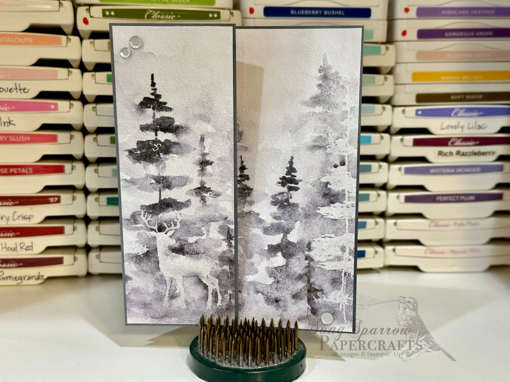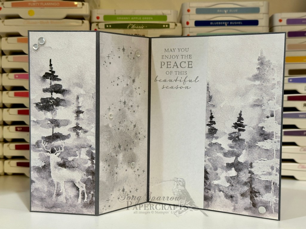 This design uses the single Z fun fold. A sheet of Basic Gray serves as the card base and the same sheet of Winter Meadow is our focal image for the front when the card is closed. One thing you’ll notice when dividing this sheet of designer paper is how the placement of the deer in the evergreens moves across the paper when you cut the full 12×12 sheet into pieces, which works beautifully for different fun fold designs. For this card, I selected the piece where the deer was off to one side — the left in this case. The single Z fold creates two 2″ folding panels, and this perfectly aligned the deer for the left fold-over panel and I placed the remaining portion on the base on the right so that, when the card is closed, the two pieces meet to complete the scene, and I added a touch of Wink of Stella to the deer and white tree for some ethereal sparkle. For the remaining 2″ panel, I used the backside of the deer pattern, which reminds me of a snowy fog, and I used the snow pattern from the Stars at Night stamp set to give the feeling of falling snow. I completed the snowy theme by adding some white adhesive sequins throughout the design to draw the eye across the full design of the card and highlight the sparkle of freshly falling snow in each panel.