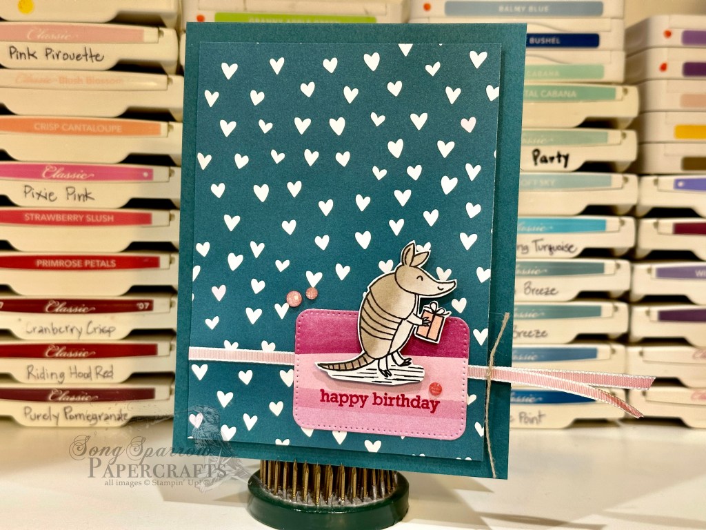 A sheet of Pretty Peacock serves as the card base and the hearts from the Delightfully Eclectic designer paper pack is the perfect backdrop for the birthday theme. Since pink is my friend’s favorite color, I wanted to make all of the pink elements *pop*. I used the ombre sheet of pink stripes from the Bright & Beautiful designer paper pack to serve as the sentiment panel and base for the cute armadillo, which is fussy cut from the Zoo Crew DSP. Some Wink of Stella on the package really helps it shine. The faceted pink gems keep the focal point tight. And the gusseted taffeta Pretty in Pink ribbon adds an additional feminine touch to the design. But my favorite part of the whole design is that armadillo! Maybe it’s the Texan in me….
