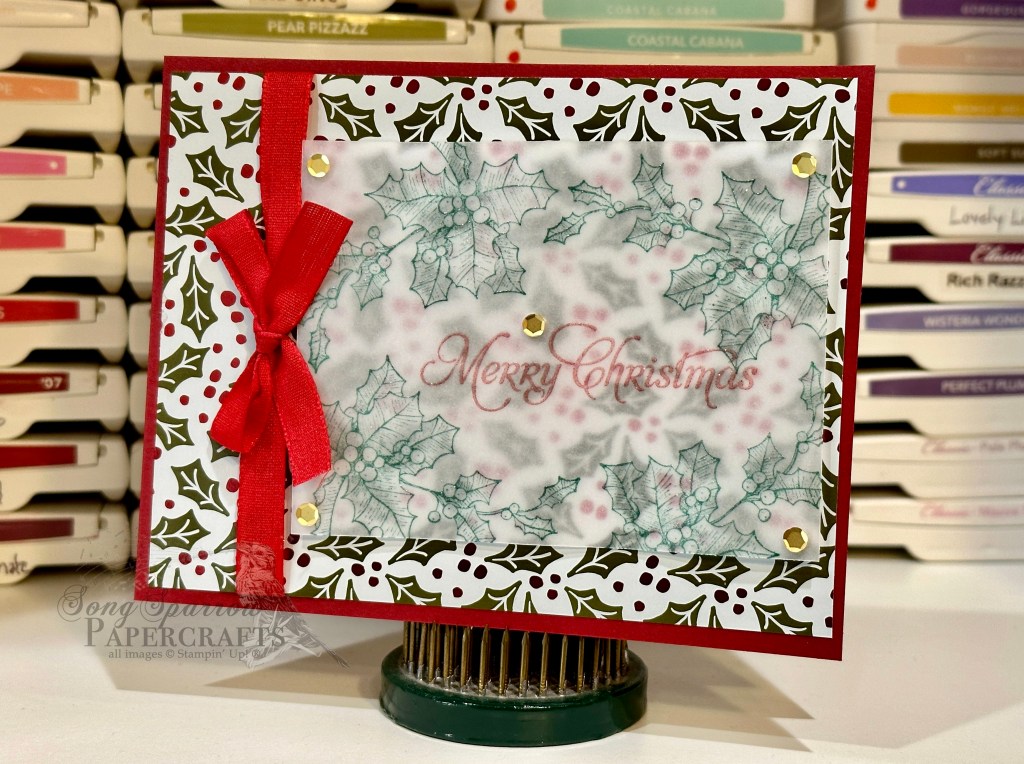 A base of Cherry Cobbler provides the festive backdrop for the holly designer paper. The inspiration design had a solid sentiment panel with a diecut holly wreath. Because I wanted to see more of the beautiful foiled designer paper, I used a sheet of vellum for the sentiment panel and chose to stamp the holly wreath and nestle the sentiment in the center. Rather than placing the bow atop the wreath, I chose to use it as a design element along the side of the wreath instead.