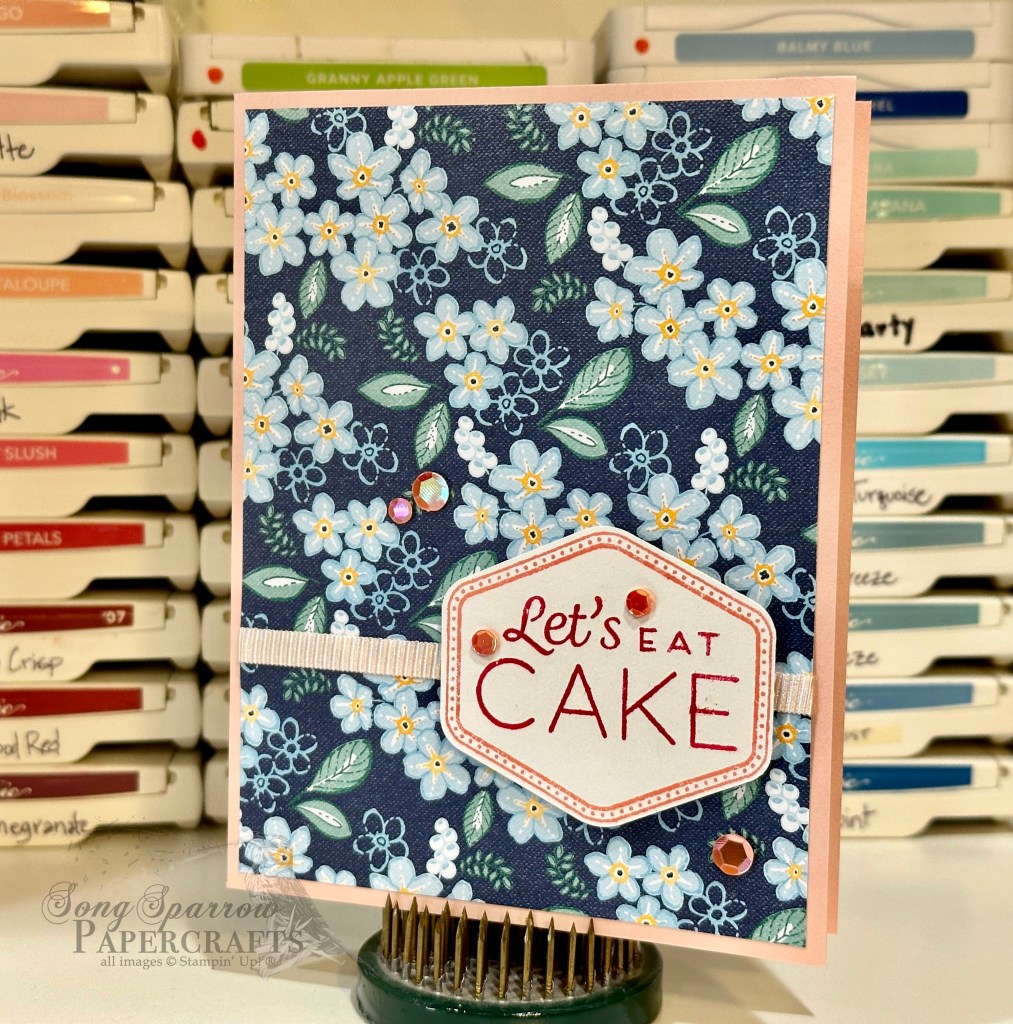 I had just gotten a delivery of clearance product, and I knew the Regency Park paper was going to be perfect. The base of this card is Blushing Bride with the sheet of Regency Park taking center stage. The sentiment panel is punched from white cardstock using the Heartfelt Hexagon punch. I used two different shades of pink to give visual interest to the sentiment and help it to stand out against the busy floral background. The ribbon helps break up the background, as well. The sparkle from the sequins gives a festive look and helps draw the eye across the design to the sentiment. I love this bright and happy design, don’t you?