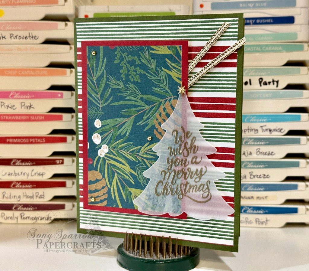 The card base is Mossy Meadow, which helps draw out the shades of green in the evergreen branches in the greenery panel. The evergreen panel is matted by Cherry Cobbler cardstock and mounted on dimensionals. The tree is diecut using the Merriest Trees dies and the sentiment is heat embossed in gold in the center of the tree. To keep the tree topper more delicate, I placed a star trinket at the top. The gold trim is tucked behind the elevated focal panel and gold pearls are scattered on the focal panel for visual interest. My favorite part of this design is the Christmas tree. What is yours?