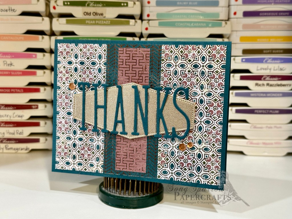 I had two scraps of foiled All About Autumn designer paper that I wanted to use — one Pretty Peacock and one Moody Mauve. I thumbed through the All About Autumn pack and found the foiled mosaic that coordinated perfectly. So I started the design with a base of Pretty Peacock to provide a solid, earthy anchor for the busy foiled patterns of the selected designer papers. I wanted to pull the gold elements from the mosaic sheet and decided to diecut gold glimmer paper using the Nested Essentials dies. Rather than stamping a sentiment on this panel, I opted to diecut the word THANKS using the Alphabet a la Mode dies from a scrap of Pretty Peacock to tie all of the card elements together. The sentiment panel is adhered using dimensionals. The twist of copper twine and scatter of copper sequins add additional visual interest and sparkle and tie all of the card elements together for a more cohesive look throughout the design.