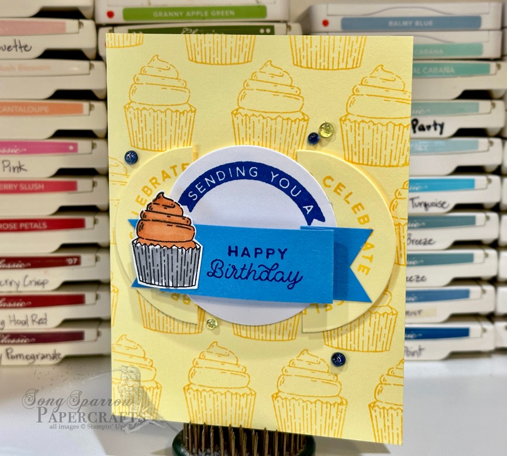 The card base is a sheet of Lemon Lolly cardstock. I elected to make my own background using Daffodil Delight andthe focal image stamp from the Circle Sayings stamp set. The center sentiment panel is comprised of several layers. The base is a punched circle and sentiment from Circle Sayings stamped in Daffodil Delight. This circle is cut in half and then set aside. The focal sentiment is stamped in Blueberry Bushel on a circle punched from white cardstock. I spaced the yellow half-circles in the center and so that they were equidistant from the card edges and adhered the white circle between them to make a continuous panel. To make the center banner sentiment, score a piece of Azure Afternoon cardstock at 1″, 1 1/2″, 4″ and 4 1/2″, fold on the score marks, and then snip a triangle to make each of the banner ends. The sentiment is stamped in Blueberry Bushel. I stamped the cupcake image in black, colored with Stampin’ Blends, fussy cut it, and then adhered on the banner next to the sentiment. Tinsel gems were added for some sparkle and to help direct the eye across the design to the sentiment.