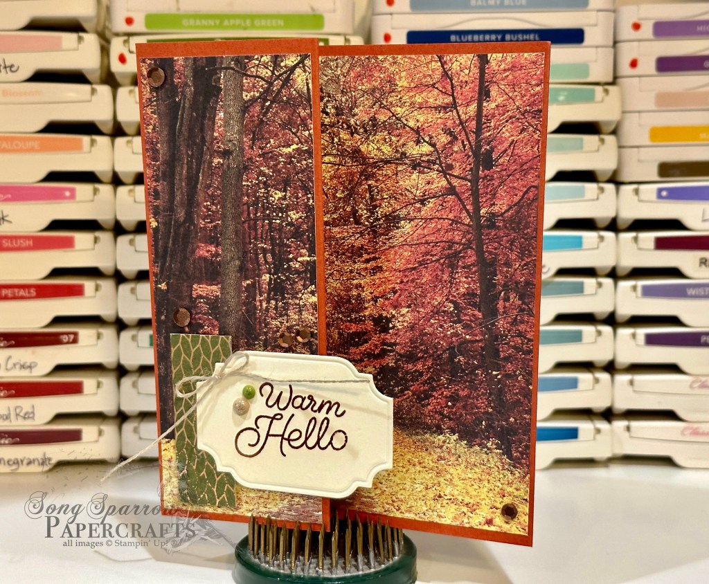 This card design is set atop a piece of Cajun Craze cardstock. The z-fold design allows the use of the entire sheet of DSP, minus a small half-inch strip at the bottom. I kept the front sentiment panel small to ensure the inside message panel is easily accessible. The sentiment from Circle Sayings is stamped on a Very Vanilla panel diecut using the All That dies. To draw the eye, I used a small scrap of the foiled side of the tree sheet leftover from the Fabulous Friend card (see that design here) and added a small twine bow, along with some speckled dots and sequins.