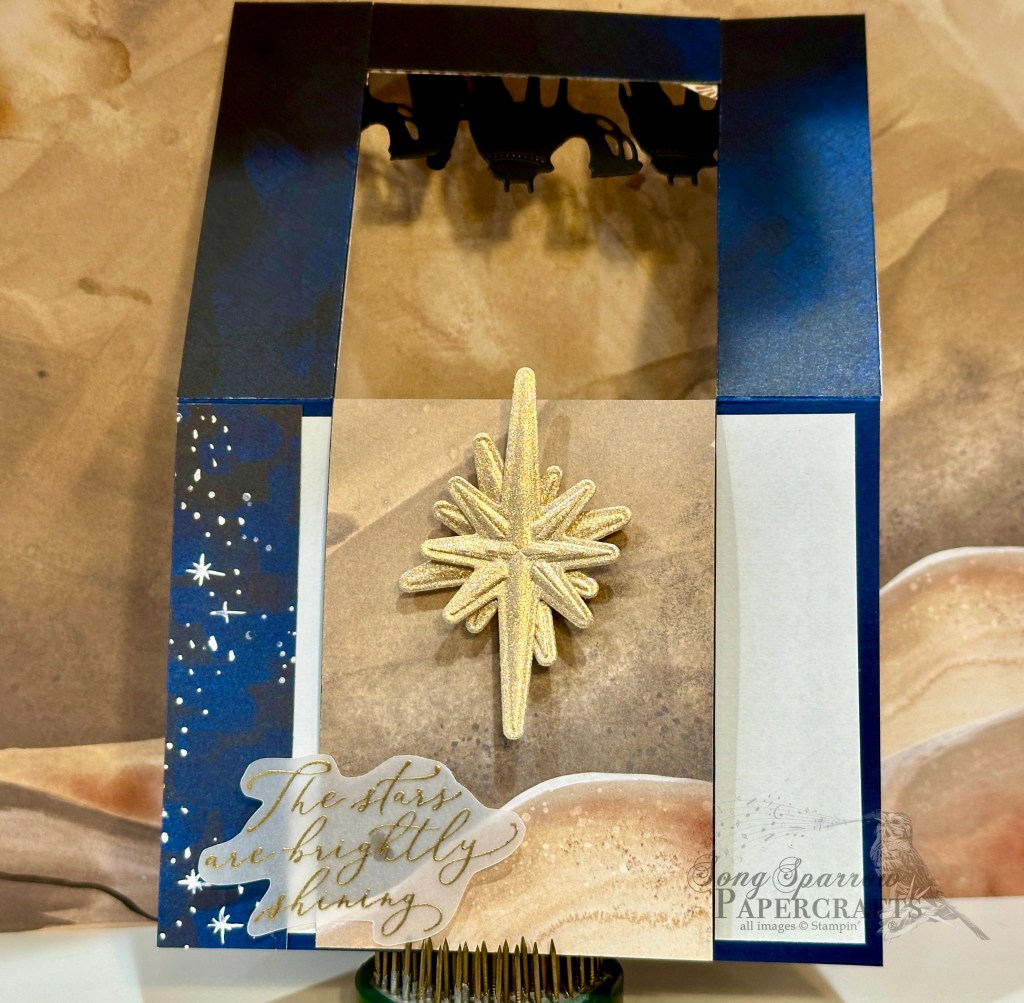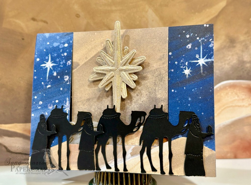 Night of Navy cardstock as the base. The starry sky and desert paper designs are both from the O Holy Night designer series paper pack. The camels and wise men are diecut from Basic Black cardstock using the Night Divine dies. The camels are reversed to have them traveling in the same direction with the wise men, and each wise man is elevated on mini dimensionals to give depth to the scene. The Star of Bethlehem shines brightly in the sky and is diecut from gold shimmer paper and embossed using the Stars at Night hybrid embossing folder and dies. Dimensionals separate each layer of the star to draw the eye and emphasize its prominence above all other stars in the night sky. The star panel remains as you lift the top section of the card front, and this reveals the sentiment which has been heat embossed in gold atop a vellum sheet. The message panel underneath has been left blank for a personalized note to the recipient.