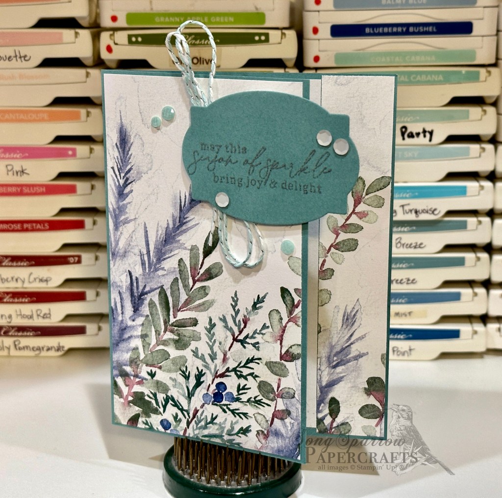 This card design is built on a base of Lost Lagoon cardstock that is cut with a peek-through design. I chose the winter branches pattern from the Winter Meadow paper pack to serve as the focal image for the card. A 1-inch strip is adhered to the message panel on the card base and serves as the peek-through element for this fun fold design. The sentiment panel is diecut from Lost Lagoon using the All That dies. The sentiment from the Magical Meadow stamp set is stamped tone-on-tone. A mixture of matte white sequins, fine sparkle gems, and Silver & Pool Party baker’s twine add a touch of sparkle to the scene.