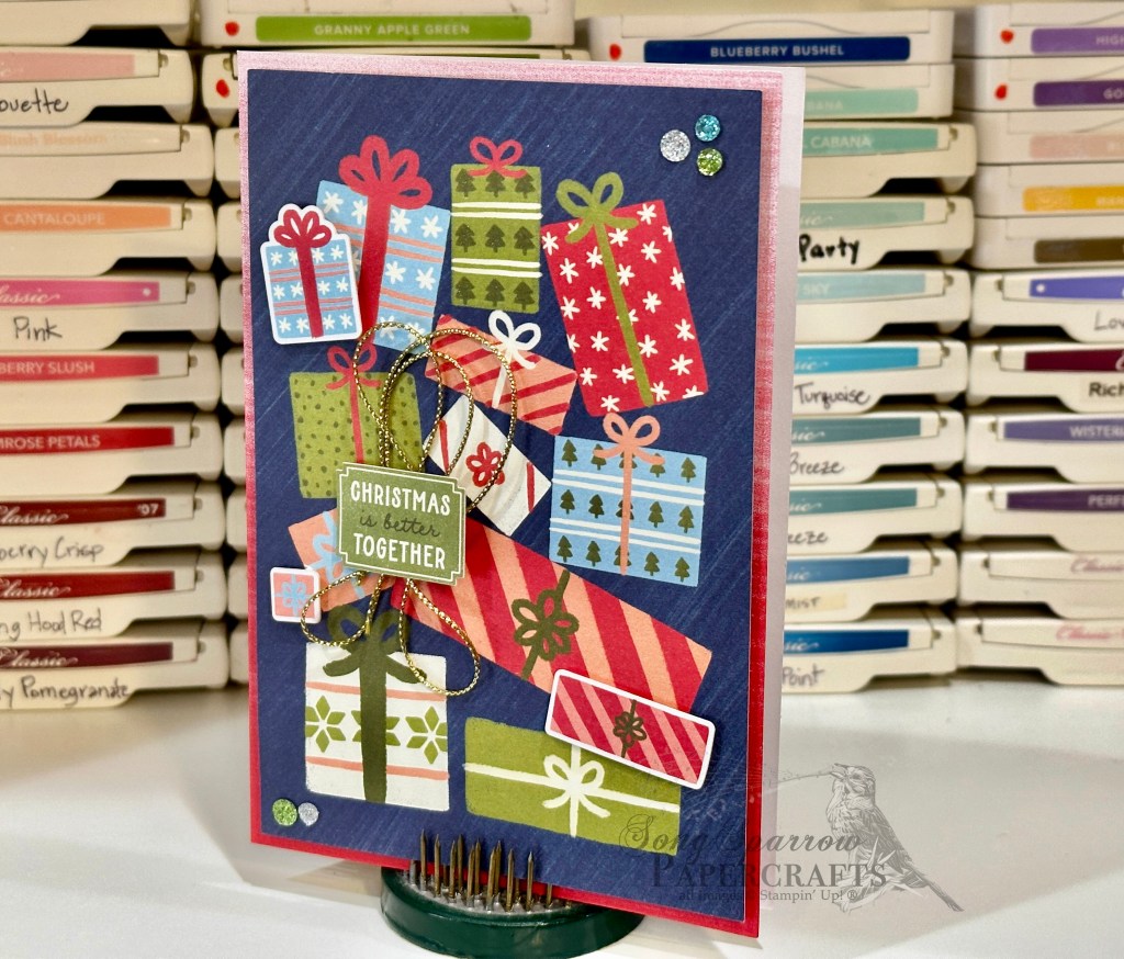 Today’s card begins with the red card base from the Memories and More cards and envelopes pack. The adorable present background is a notecard from the Memories and More card pack. I chose coordinating package stickers from the sticker sheet included in the card pack and popped them up with dimensionals. I nestled each package next to its coordinating counterpart on the notecard background and just love the effect. The sentiment is yet another sticker from the sticker sheet. I used gold cord to draw the eye to the sentiment since it’s a smaller element than I would have ordinarily chosen. A few glitter sequins in opposing corners really allow the eye to make the diagonal movement over the card design.