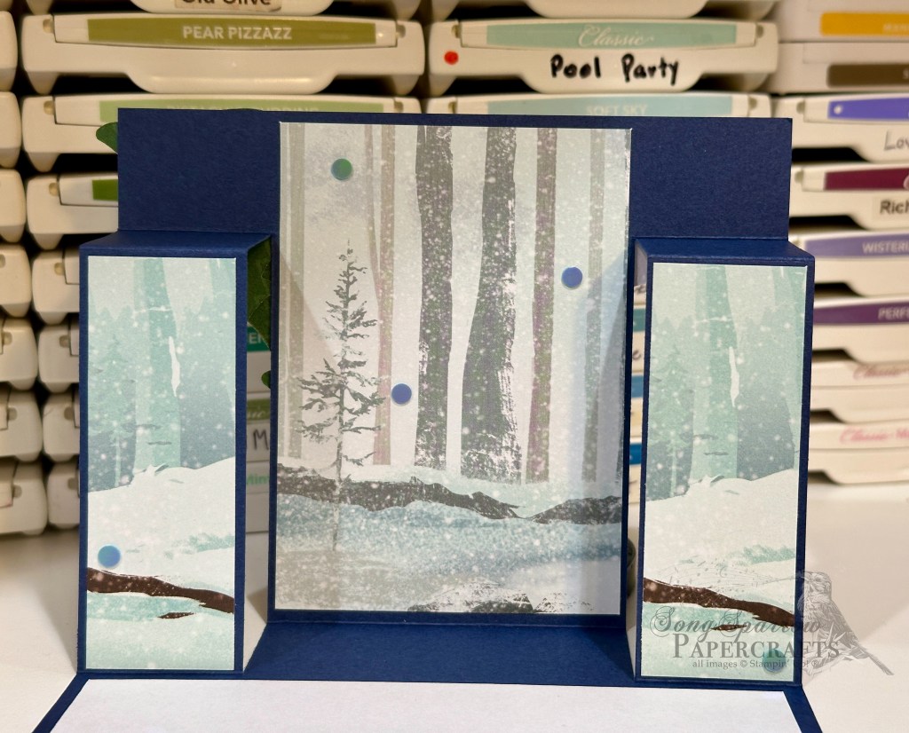This card is built on a base of Night of Navy cardstock. I used two different patterns of the One Horse Open Sleigh designer series paper pack to complete the card front and inside panels. The trees and bear are cut from a sheet of A Walk in the Forest. The Merriest Trees die set coordinates perfectly with the trees and the Beary Cute punch easily punches the bear. The sentiment from the Charming Sentiments set is stamped on a shimmer white panel diecut using the Nested Essentials dies. Some iridescent discs add a little touch of sparkle and draw the eye across the card. You can find the instructions for this fun fold here.