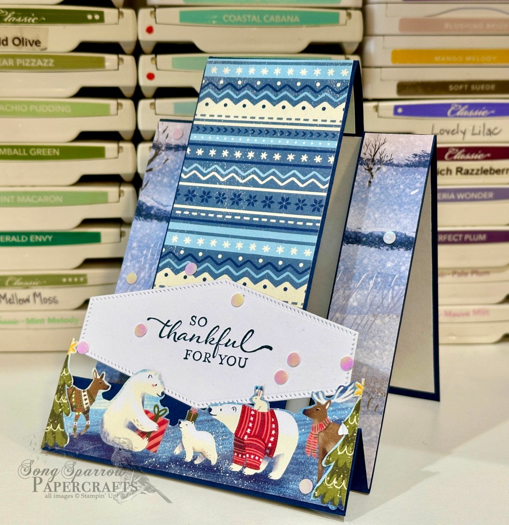 I tried a portrait variation of this fun fold using Jackie Bolhaus’s design, but I definitely need to work on it as things didn’t exactly line up as they should have so it sits a little catterwompass. But it turned out really cute, so I’m going to show it to you anyway. Haha! I combined One Horse Open Sleigh with the Beary Cute Memories and More products.