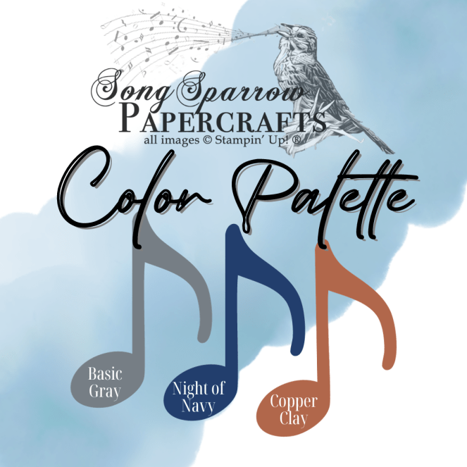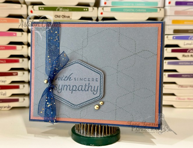 So today’s card is built on a base of Basic Gray cardstock, while Night of Navy and Copper Clay luster cardstock serve as the mats for the main image panel. The single-framed hexagon from Heartfelt Hexagon is stamped in Smoky Slate in a repeating pattern that mimics the pattern of the Softly Sophisticated embossing folder. I liked the look of the larger stamped pattern rather than the smaller pattern for this particular occasion. The sentiment from Heartfelt Hexagon is stamped in Night of Navy on Basic Gray and then punched with the coordinating hexagon punch. The Night of Navy and gold glittered ribbon — a carry-over from the Holiday Mini catalog — adds a soft touch and ties the blue elements together, while a few brushed metallic dots tie together the sheen of the luster paper and sparkle of the glitter ribbon and add an additional layer of warmth.