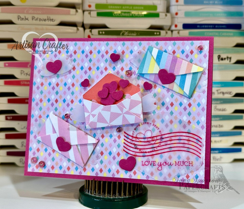 Two of the envelopes are winging their way to their recipients while the one in the middle is so full of love that it simply burst at the seams and all of that love has come floating out. The hearts are diecut from Berry Burst cardstock using the Sending Love hearts dies. And don’t you just love the escaping heart fluttering away up in the upper corner?! The sentiment is stamped in Melon Mambo ink on vellum that has been punched using the Heartfelt Hexagon punch. By placing the sentiment on vellum it allows it to appear as though it’s floating in the scene — perfect for flying envelopes, don’t you think? I really love how the tinsel gems draw the eye diagonally across the card.