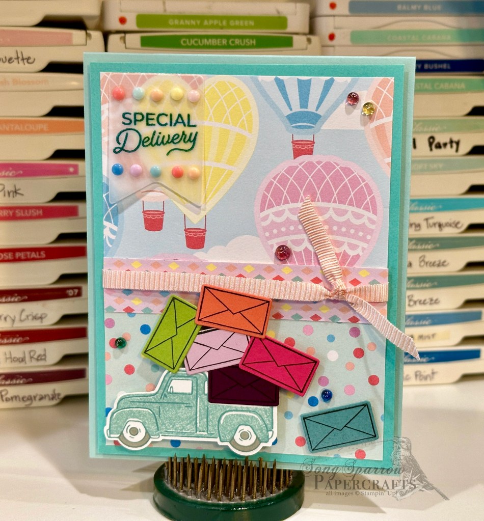This card is built on a base of Pool Party cardstock. The center focal panel is matted with Coastal Cabana to draw the eye and allow the variety of colors to pop. I stamped the truck in Lost Lagoon and Pool Party and loaded the back with envelopes stamped and diecut with the Sending Love bundle. I pulled a variety of colors for the envelopes for a bit of interest and to punch up the fun. To give a sense of movement, I let the Lost Lagoon envelope spill from the back of the truck. The truck is able to stand out in this busy scene by placing it on doubled dimensionals. I wanted to keep the front sentiment simple and understated, so I stamped it on a diecut vellum banner and used rainbow dots to add punches of coordinating color to tie everything together.