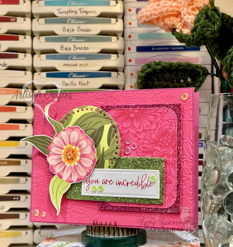 I’ve been so inspired by our monthly Luv 2 Stamp Team challenge to use our designer series paper. When I saw this week’s sketch by Freshly Made Sketches over on Instagram, I had so many ideas for incorporating my stash of DSP. So today, I’m starting with the Flowering Zinnias because …. well, I just love zinnias. *wink*