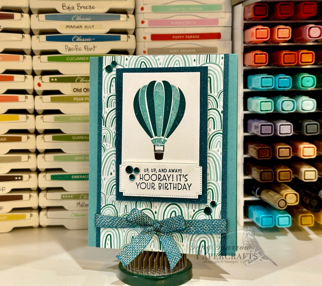 This week, we’re flying high with Stampin’ Up! sets that feature vehicles of flight. Thus far, we’ve been soaring with the Hot Air Balloon bundle. And today’s design is (almost) directly inspired by fellow SU! demo Anne Granger. Just a few tweaks here & there with products I had on hand and *voila* a fantastic birthday card ready to hoist your well wishes.