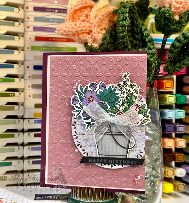 For today’s card, we get started with a card base of Blackberry Bliss cardstock. The background panel consists of two layers. The mat is Pretty in Pink and the foreground is a piece of Moody Mauve that has been machine embossed using the Eyelet embossing folder. The focal panel base is a piece of the lighter grey woodgrain pattern from the Country Woods designer paper pack that has been diecut using one of the larger Spotlight on Nature circles. The milk tin and floral bunches from Country Flowers have been stamped on white cardstock and then colored with Stampin’ Blends. The tin and flowers are adhered to the focal panel with dimensionals with the florals just a smidge higher than the tin they are resting in. A bow of striped iridescent ribbon sits just underneath the flowers at the top of the tin. The sentiment from Something Fancy is heat embossed in white on black cardstock and then cut into a thin strip with the paper trimmer. A few Berry Burst sequins from the sequins trio are placed to draw the eye across the design.