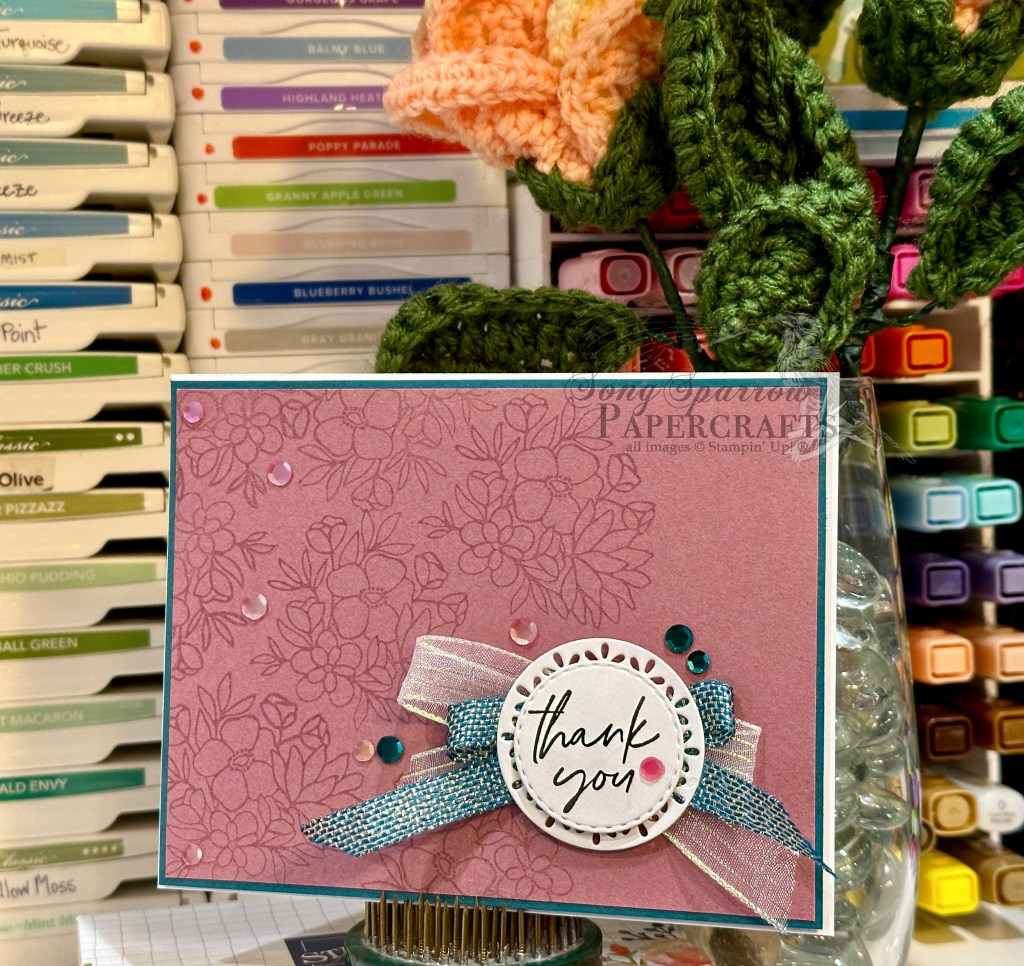 We get started with a card base of Basic White cardstock. Our focal panel is a pairing of Pretty Peacock and Moody Mauve cardstock. I stamped a repeating floral image in Versamark using the Country Flowers stamp set. The sentiment from Something Fancy is stamped in black on white cardstock and then diecut using the Unbounded Love set, which is then matted with a circle diecut using the Spotlight on Nature set. A pair of faux bows using Pretty Peacock & gold metallic ribbon and iridescent striped ribbon are adhered by the sentiment panel. To draw the eye across the design, I’ve used pink and peacock sequins from the Sequins Trio for some sparkle.