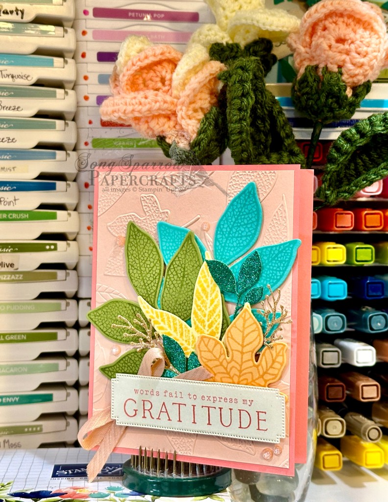 I wanted a light and bright color palette for this thank-you card. I did let Mother Nature do a little of the talking with the choices in leaf color but then I worked to fill in with some fun complimentary colors. Our card begins with a base of Flirty Flamingo cardstock. The background panel is a quarter panel of Petal Pink embossed with the soon-to-release Changing Leaves embossing folder. I cut this panel down a bit to have a nice border of Flirty Flamingo all around. Our focal images are a whole smattering of stamped and diecut leaves from the soon-to-release Changing Leaves stamp set. All of the images are stamped tone-on-tone. Two of the larger leaves are stamped on Old Olive and Summer Splash with the two smaller leaves stamped on Lemon Lolly and Peach Pie. I added a few sparkly elements with the Peach Pie and Summer Splash foliage tucked in the mix. The sentiment from Simply Zinnia is stamped on Very Vanilla cardstock and diecut with the Autumn Leaves die set using the extension method. (For more on using the die extension method, check out this quick tutorial.) I tucked a faux bow of Petal Pink diagonal trim behind the sentiment panel and added a few Peach Pie shimmer gems across the card front for added sparkle.
