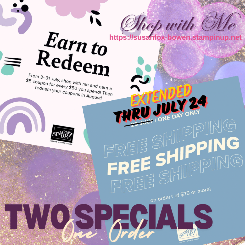 Good news for anyone who didn’t get an order placed yesterday. Stampin’ Up! has extended the free shipping special thru end of day TODAY. So now is the perfect time to stock up on all of the items on your shopping list because a $75 order (and above) qualifies for FREE shipping and for every $50 you spend you earn a bonus coupon to spend in August. But don’t delay — the sale ends today!