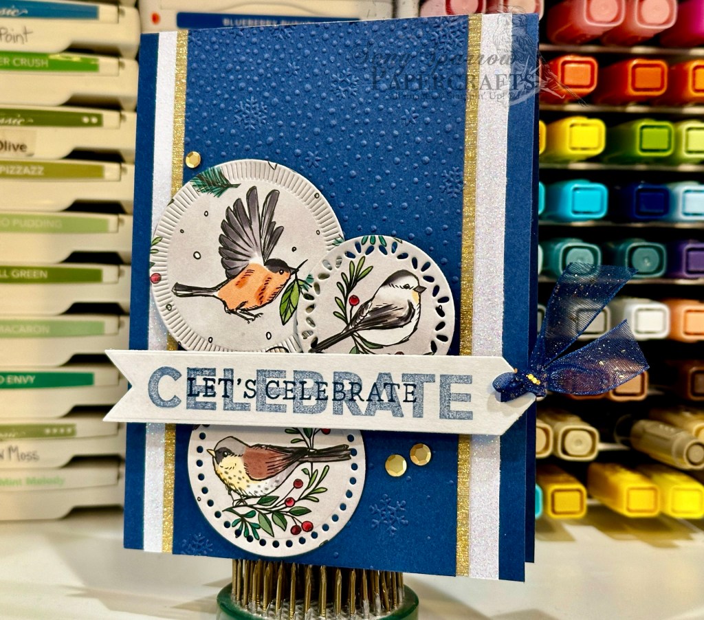 And today, we’re starting with the new Nests of Winter designer paper. We’re using the detailed bird patterned paper to create a celebratory card. While it’s a little wintery, the design doesn’t feel like a holiday card. This card would be perfect for a winter birthday, promotion, retirement, or graduation.
