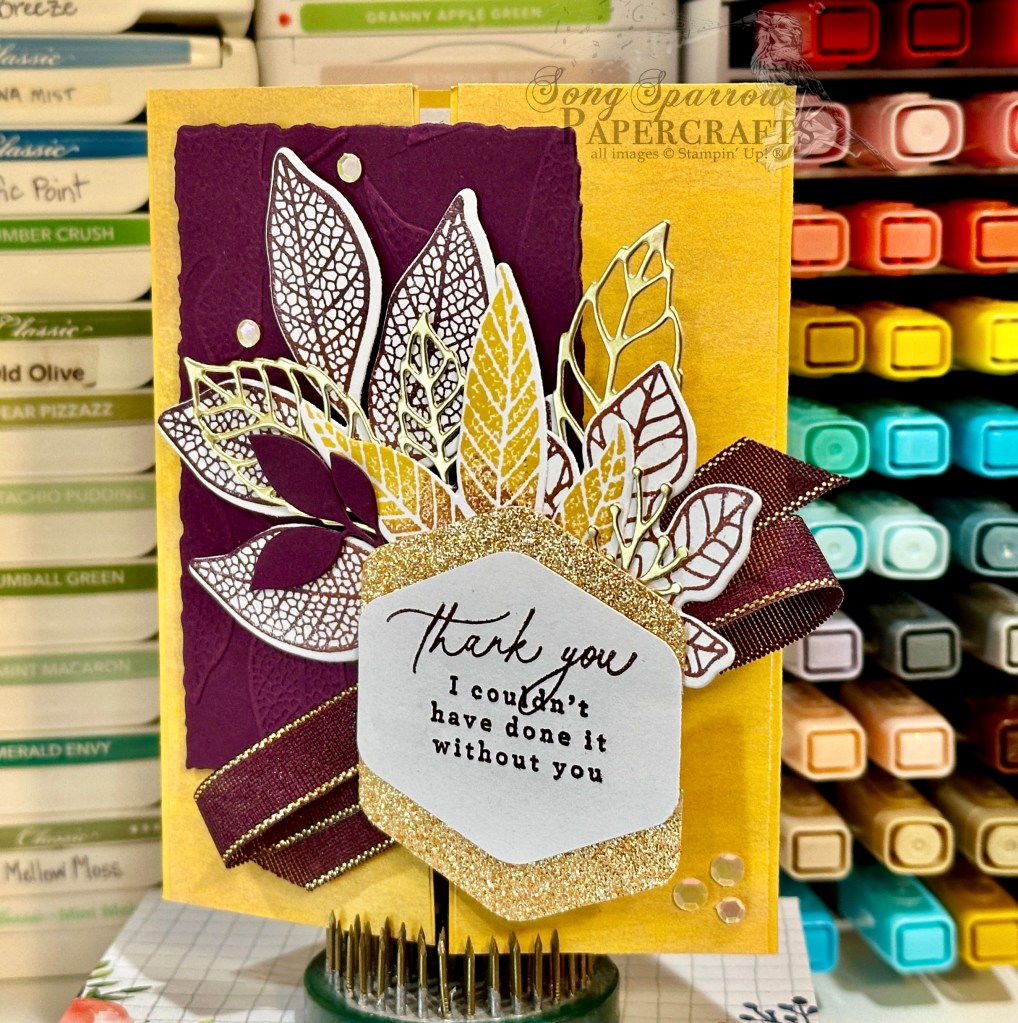 To give an opportunity for our gorgeous leaves from the Changing Leaves bundle to take center stage, we’re working with the barn fold today. And we get started on today’s card with a base of Crushed Curry cardstock. We cover each of the front flaps of our barn fold with a strip of paper from the Splendid Autumn paper pack. The pattern is a very subtle brushed, grainy texture that gives some nice depth in our color palette. Next up, we emboss a quarter panel of Blackberry Bliss cardstock using the Changing Leaves hybrid embossing folder and then diecut it into a smaller panel with one of the larger Deckled Rectangles dies. On a quarter sheet of white cardstock, I traced the outside of the trio of leaves from the Changing Leaves die set in pencil to make it easier to stamp each of the leaf images and then diecut all at once. I used a combination of fall colors to ink each leaf from the stamp set, including Copper Clay, Blackberry Bliss, and Crushed Curry, and imitated the look of leaves in a color metamorphosis by going over sections of each leaf with other colors for a subtle two-toned look. I diecut a few additional leaves in gold foil and Blackberry Bliss and then layered everything together to create a leafy focal section behind the sentiment panel. Our hexagonal sentiment panel consists of a white center panel and mat of Peach Pie glimmer paper. The sentiments from Everyday Greetings and Changing Leaves are stamped in Blackberry Bliss. Our focal panel section is finished off with Blackberry Bliss & Gold textured ribbon from the upcoming Holiday Mini catalog, releasing next week on September 6th. A few shiny sequins finish things off with a little extra sparkle and help draw the eye across all the gorgeous design elements on the front of this card.