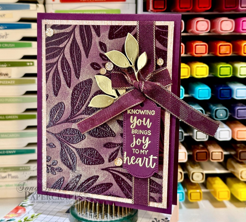 This week, we’ve been all about the autumn designs and looking at a variety of different ways to pair Stampin’ Up! products or to use techniques. Today, we’re revisiting the emboss resist technique with this card design which features the Leaf Collection background stamp. I recently saw a card posted by a fellow demonstrator that paired this stamp with a Blackberry Bliss and metallic gold color palette. It was super elegant and I wanted to give it a twist. So let’s see how it all comes together.