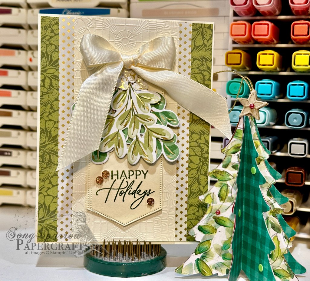 Today, we’re continuing a closer look at the Stampin’ Up! Season of Green & Gold suite of products. This suite includes beautiful gold-foiled patterned papers, coordinating vellum, stamps & dies, and lovely satin ribbon. Today’s card is another take on a traditional holiday design.