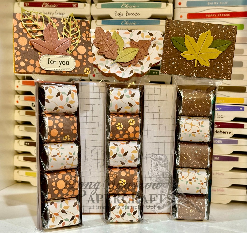 When I’m preparing craft booth items, I always start by using the retired product in my stash. So these nuggets use several different packets of retired fall-inspired paper patterns. And then I dress up the packaging with dies that meet the theme. We have such lovely fall-inspired die sets that I, of course, had to reach for both Autumn Leaves and Changing Leaves for my dress-up elements for these nugget packets. I’ll be offering a variety of seasonal packaging for the nugget treats, including fall, Halloween, and Christmas.