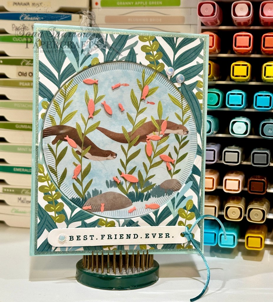 Today’s card starts with a base of Pool Party cardstock. Our backdrop is a combination of Lost Lagoon shimmer pape (sadly retired) and the water foliage pattern from the Otterly Adorable paper pack. Using the largest circle from the Spotlight on Nature die set, I cut a circle through all layers of the card front. Separately, I also used the die to cut the two swimming otters from a separate patterned sheet from the Otterly Adorable pack. I adhered the swimming otters panel to the Pool Party circle and then to a quarter sheet of Pool Party to keep the inside of the card neat and tidy and one color. Behind our backdrop panel, I mounted some acetate to serve as the peek-through window into the water below and adhered all of this to the card front. From Flirty Flamingo, I cut several sets of the smaller fish using the Otterly Amazing dies and let them free-float on the acetate. Our swimming otter panel is adhered to the inside of the card using dimensionals to allow a little room for our fish to swim in the window. The sentiment from Country Flowers is stamped in Pretty Peacock on white cardstock diecut using the Greetings of the Season die and finished off with the Lost Lagoon soft cording. A few riverside irregular pearls add that last touch of sparkle to the design.