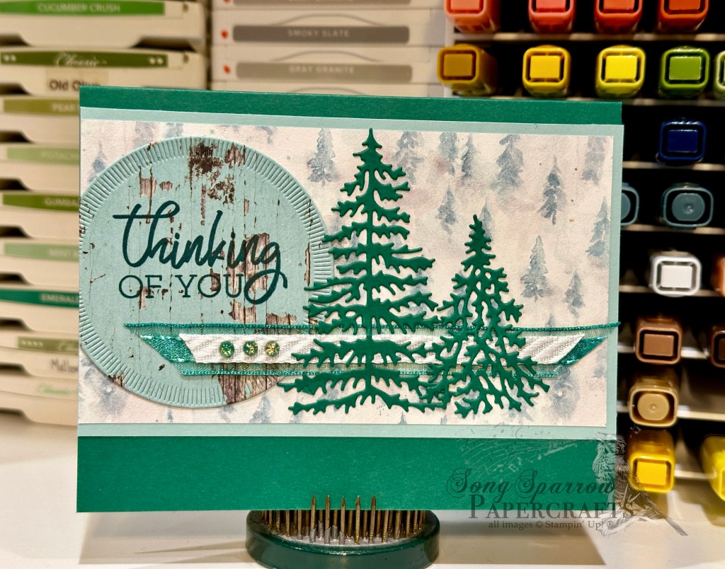 We get started with a base of Shaded Spruce cardstock. Our focal panel is a strip of the snowy evergreen forest pattern from the Winter Meadow designer series paper pack that is matted with Pool Party to really bring out the more subtle blues. Our sentiment panel is cut from the blue woodgrain from the Country Woods patterned paper using the Spotlight on Nature dies. He sentiment from Friends for Life is stamped in Pretty Peacock. Our focal trees are from the Frosted Forest die set and are diecut from Shaded Spruce and adhered over a strip of layered Shaded Spruce satin ribbon and white diagonal trim. A few carefully placed regal foiled dots finish things off with a little pop of color and sparkle.