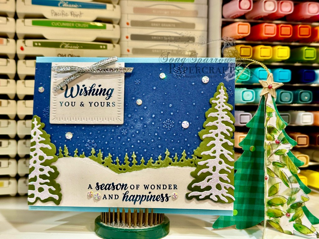 We get started with a base of Balmy Blue cardstock. Our backdrop is a panel of Night of Navy that is machine embossed with the Snowflake Sky embossing folder and then lightly brushed with white craft ink to really bring out the beautiful soft snowflakes. Our snowbank is a simple piece of white cardstock that is torn to create the soft edges of a snowy hill. The Mossy Meadow trees are diecut with a combination of the In the Grove and Peaceful Evergreen dies. A touch of craft ink to the edges of the treeline and a bit of white glimmer paper on the larger evergreens in the foreground make for the perfect dusted evergreen grove. The sentiment from the Peaceful Season stamp set is stamped in Night of Navy in the center of a white banner cut with the Radiating Stitches die and then finished in the snowbank. Dimensionals help give lots of depth to our scene, and the silver trim and iridescent faceted gems lend the sparkle.