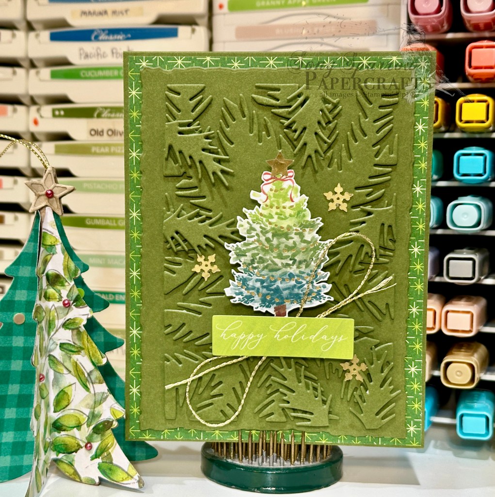 I love creating designs that seem to be peering through the trees. I’ve made several cards over the last couple of months that use this design concept. Today, we’re peering through the evergreens to this lovely Christmas tree in the center.