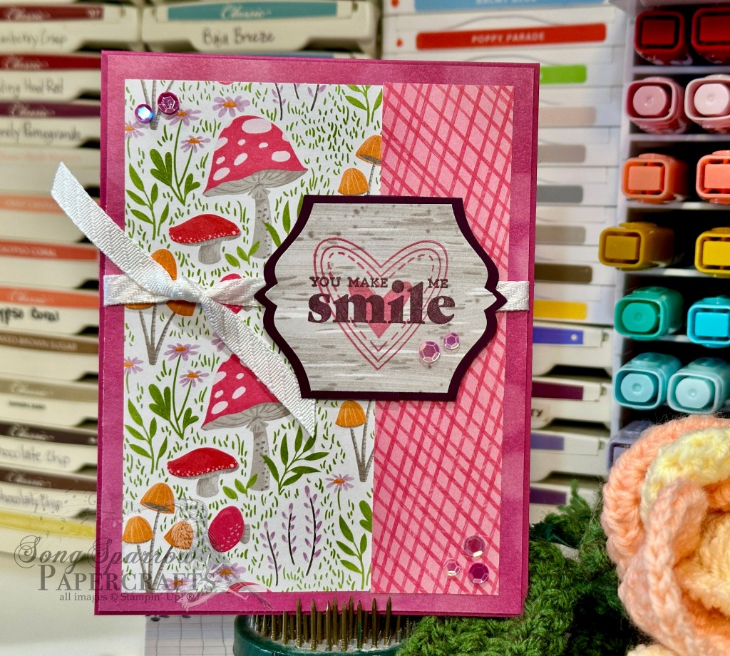 And that’s the inspiration behind today’s card design using the Toadstool Gardens patterned paper. This week, we’re using the new Hugs for Love stamps & punch bundle to create our designs. And I thought the “you make me smile” sentiment was just perfect for today’s card with our cute mushrooms.