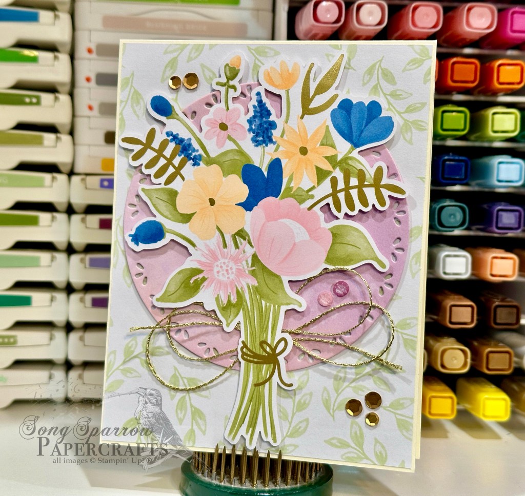 I love having a stash of cards that can apply to a myriad of situations. The new Wildflower Birthday bundle by Stampin’ Up! allows me to whip up beautiful cards perfect for any occasion. Today’s design pairs up the paper and diecuts to create this beautiful bouquet.