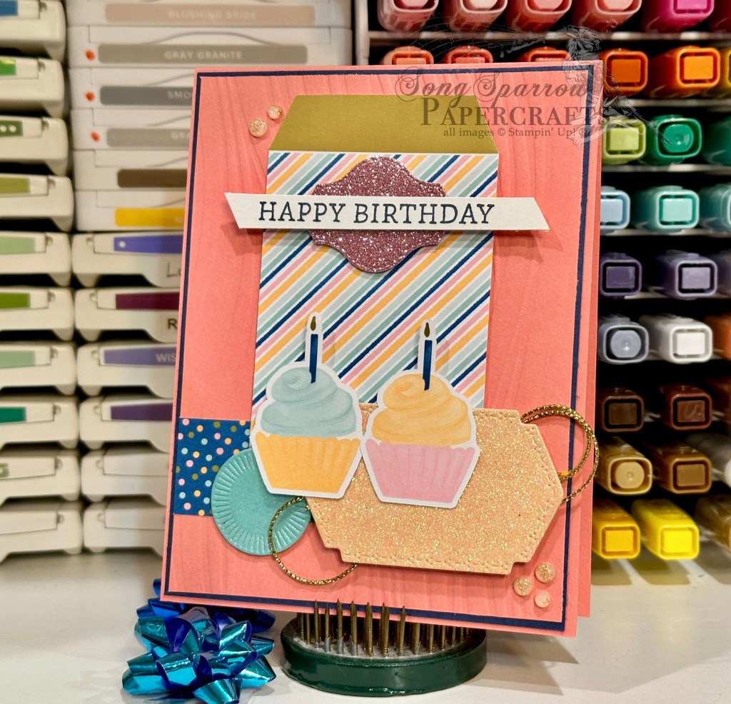 Our card gets started with a base of Flirty Flamingo cardstock. The background is a quarter-sheet of Flirty Flamingo that has been machine embossed with the Soft Waves embossing folder and then mounted on a mat of Night of Navy cardstock. Our focal section has a lot of elements from the Wildflower Birthday accessories, including the strip of blue polka-dotted paper that serves as the anchor element. Then we have the foiled and striped tag that serves as the base for everything else in our focal panel. Our cupcakes sit atop a piece of the pastel ombre glimmer paper that is diecut with the Mixed Labels dies and the small circle cut with the Spotlight on Nature dies. Dimensionals provide some depth and give plenty of room for our pop of gold thread. The sentiment from Simply Said is stamped in Night of Navy on white and then cut with paper snips and mounted on top of the decorative banner cut with the Mixed Labels die from a sheet of Petunia Pop glimmer paper. Petal Pink foil gems finish things off and tie all our peachy colored elements together.