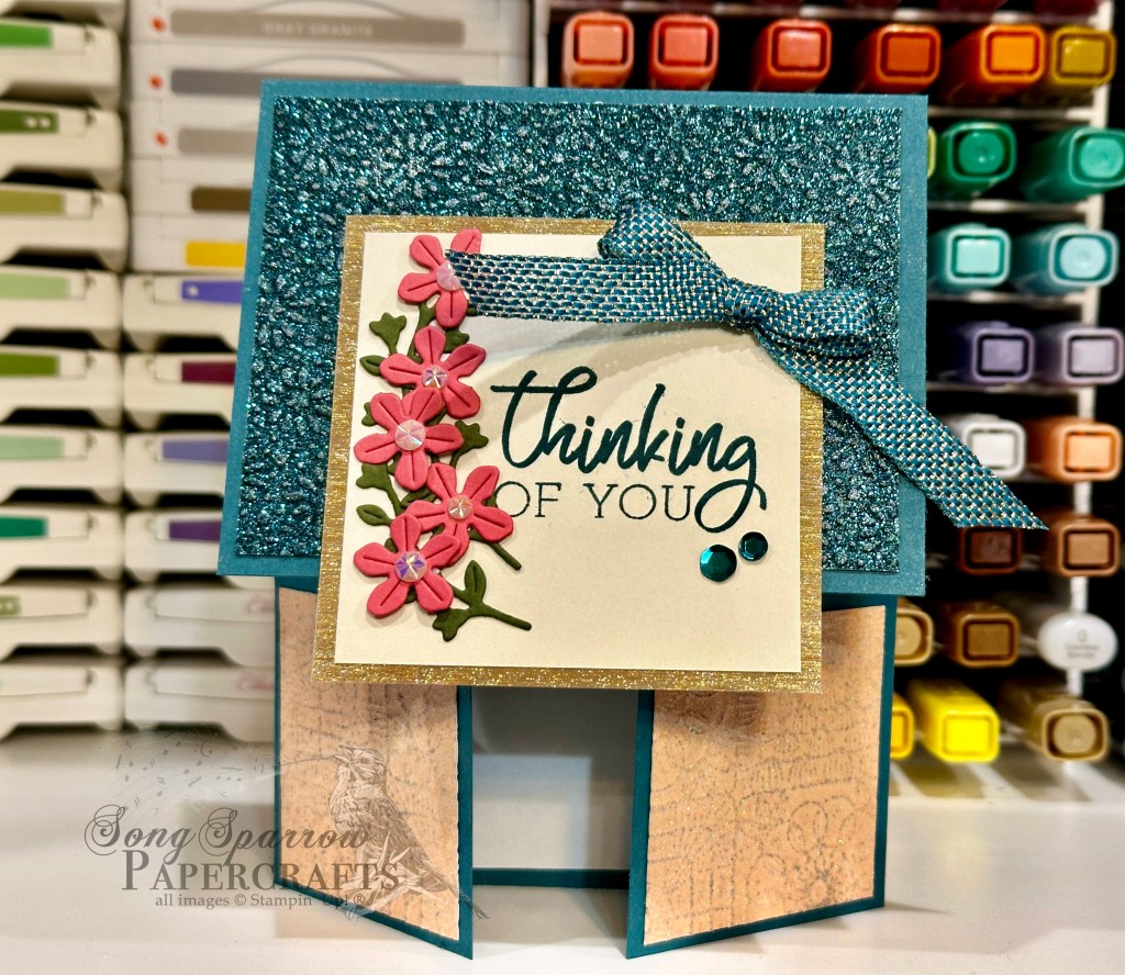 We get started with a base of Pretty Peacock cardstock. This fun fold has a larger panel up top and two smaller panels on the bottom. I kept the top panel monochromatic and machine embossed a sheet of Pretty Peacock glimmer paper with the Starstruck embossing folder. To ensure that the subtle detail of the embossing would shine through, I went over the panel lightly with my finger and some silver metallic ink. For the two smaller panels on the bottom, I machine embossed a piece of the pastel ombre glimmer paper with the Cute Crochet embossing folder. And again, I wanted the pattern to be clearly visible from all angles and so I enhanced with some platinum metallic ink. For the overlapping focal panel, we start with a base of textured gold cardstock. The sentiment panel is just a hair smaller. I stamped the sentiment from Friends for Life in Pretty Peacock slightly off-center on Very Vanilla cardstock. I flanked the sentiment on the left with some flowery vines cut from Old Olive and Calypso Coral cardstock using the Heart Shaped dies. The flower centers are iridescent faceted gems, which give a nice pop of sparkle. A small bow of Pretty Peacock & Gold metallic ribbon in the upper-right corner and a few Pretty Peacock sequins below the sentiment finish things off and ensure your eye lands squarely on the focal panel.