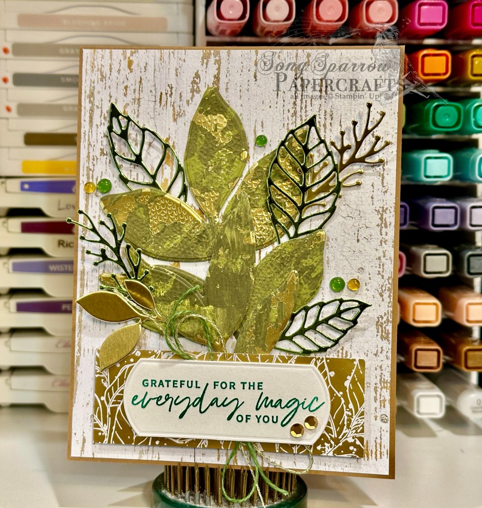 We start this design with a base of Pecan Pie cardstock. I used a sheet of the white woodgrain pattern from the Country Woods patterned paper pack as the backdrop for our focal section. Using the Changing Leaves dies and hybrid embossing folder, I cut an assortment of leaves and greenery from gold foil, Season of Elegance foiled paper, and Granny Apple green foil. I layered them with dimensionals and glue dots in the center of the card. The sentiment from Something Fancy is stamped in Shaded Spruce on white cardstock and then cut with the coordinating die from the set. The sentiment panel is adhered over gold thread and natural linen thread using dimensionals. A strip of the Nature’s Sweetness gold foil leaf pattern serves as the backdrop for our sentiment and hides the stems of our leaves festively. I added a combination of gold sequins, gold textured dots, and transparent dots for some visual interest across our design.