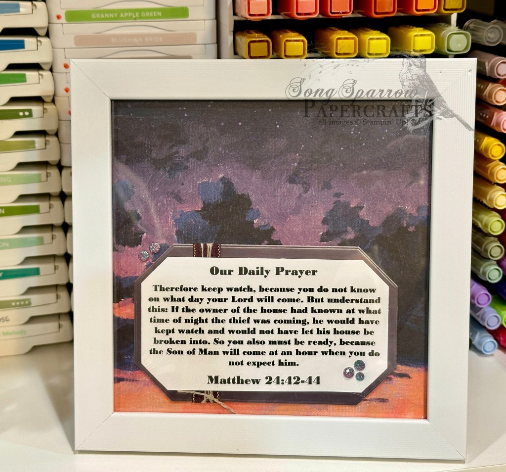 For the Holy Week prayer, I chose a darker backdrop that felt most appropriate for the significance of this upcoming week. This happens to be a sheet of the Everyday Skies paper. I printed the scripture on a quarter sheet of white cardstock and then cut it out using one of the Countryside Corners dies. I trimmed it slightly to reduce the white space on top and bottom. I then used the same die to cut the mat from a sheet of the purple Silver Foil specialty paper using the die extension method. I wrapped some Blackberry Bliss & gold metallic ribbon and linen thread around one end of the mat before adhering the sentiment on top with dimensionals. I used dimensionals to adhere the sentiment panel to the patterned paper and then added a few two tone sparkle gems for just a touch of moody sparkle.