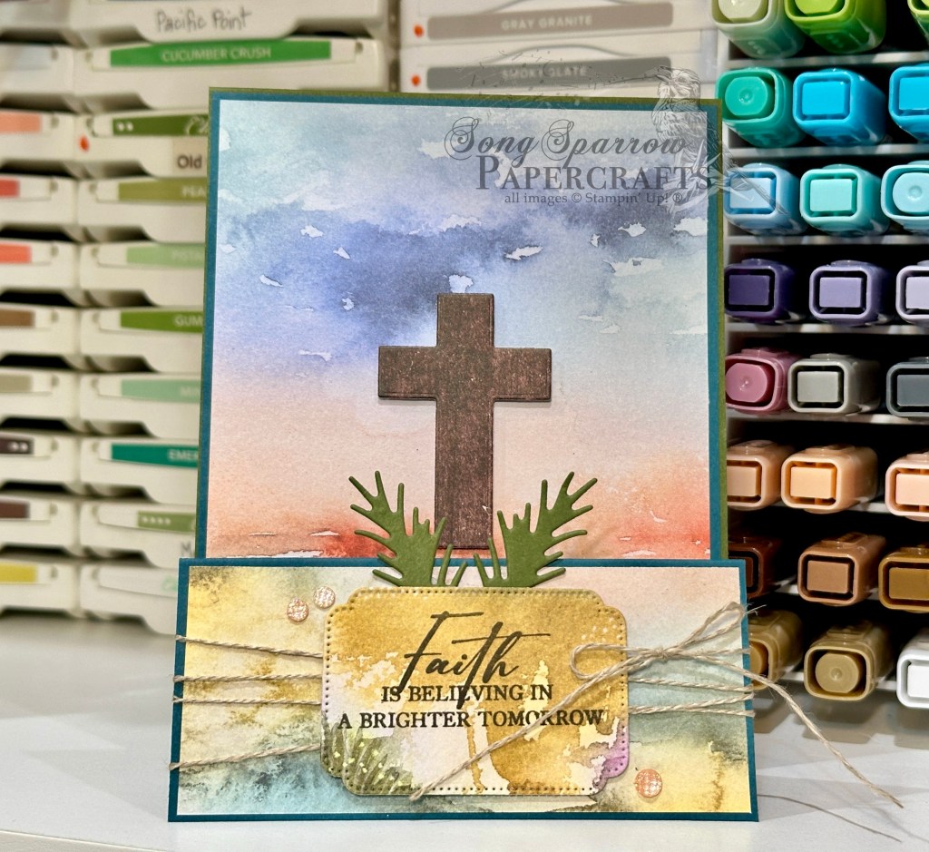 I tried several different layouts with this double easel design before settling on the one you see here. In my mind’s eye, I originally saw the cross on the smaller easel in the front, but visually it just didn’t accomplish the look I was hoping for. But when I moved the cross to the back, on what is essentially the card front, it completed the illusion of walking up the hill to the lone cross. And I just love how this ultimately gives the feeling of a contemplative walk to the cross at Calvary.
