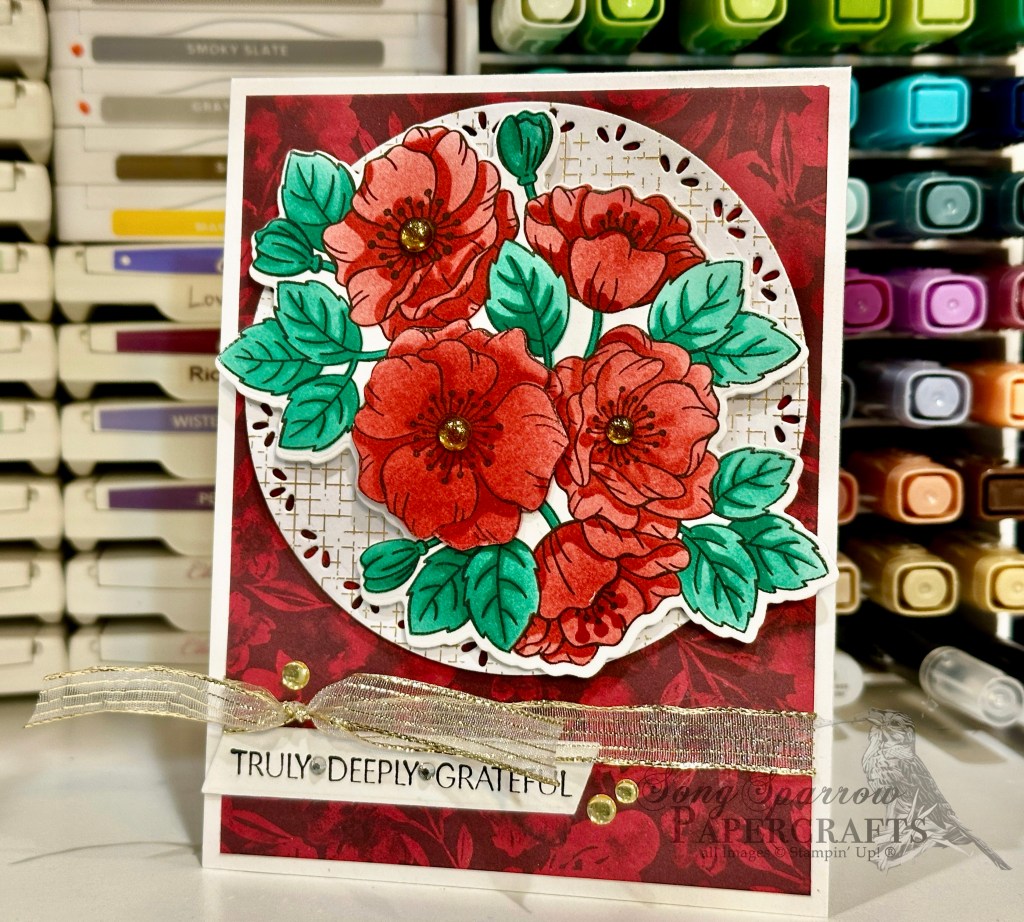 Today our card gets started with a base of white cardstock. I’m using a sheet of the retired designer series paper from the Regal Winter pack as the backdrop for our focal panel. I tied some gold stripe ribbon (coming soon!) around the bottom before adhering to the card base. The focal panel gets started with a circle base of Nature’s Sweetness paper diecut using one of the largest Spotlight on Nature dies. I stamped the focal image from the Enduring Beauty set in black on white cardstock . I also stamped the center portion of the florals a second time to be able to cut out a flower and pop it up for some realistic dimension to the flowers. I used the decorative masks to color the images with a combination of Real Red and Shaded Spruce. Hint: you don’t have to use different shades to create the darker detailed areas; use the same color for all of the subsequent layers of color and it will have the same effect as using a different shade. I cut out the full image with the coordinating die from the Enduring Beauty set and then used my paper snips to cut out the single flower that I adhered on top with dimensionals. I added gold textured dots as the flower centers. The full image is then adhered to the circle panel with dimensionals. The sentiment from the Hope You Know stamp set is stamped in black on white cardstock and then diecut with the Something Fancy angled banner die and adhered under the ribbon. I added a few rhinestones in between the words of the sentiment and some gold low profile dots around to draw the eye.