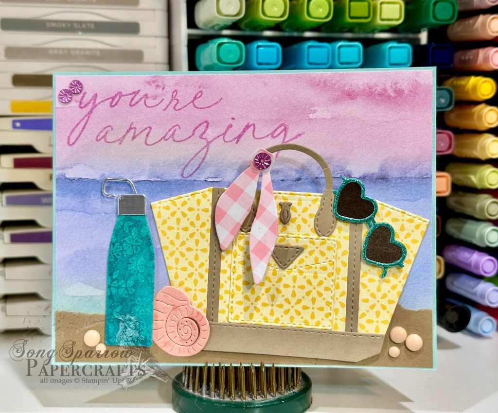 We get started with a base of Pool Party cardstock. I’m using a sheet of the Thoughtful Journey paper as the backdrop for this little beachy scene. To create the sand, we’re using a strip of Pecan Pie cardstock and then tearing it at the top to give it the look of beach sand. I stamped the sentiment from Scenic Adventure in Fresh Freesia in the top corner. Our beach bag is a combination of Floral Delight and Crumb Cake cardstock and diecut using the Notes & Totes dies. The cute sash is a small scrap of Wildflower Birthday with a starburst sequin serving as the decoration on the knot. The sunglasses are cut from Basic Black and Shy Shamrock glimmer paper and then affixed to the top edge of the bag with a dimensional. To add some beachy interest, we’re adding a conch shell and water bottle. The shell is cut from a sheet of Beautiful Bokeh. The water bottle is cut from a sheet of pastel ombre glimmer paper and silver foil and has a subtle raised pattern that is created by stamping the florals from the Notes & Totes set in versamark and then heat embossing with clear embossing powder. To help the pattern stand out and give a more decorative look to the bottle, I used a blending brush and Pretty Peacock ink to go over it and then added some wink of stella. It’s adhered next to the shell on some dimensionals. I added a few rainbow dots in the sand to finish everything off.