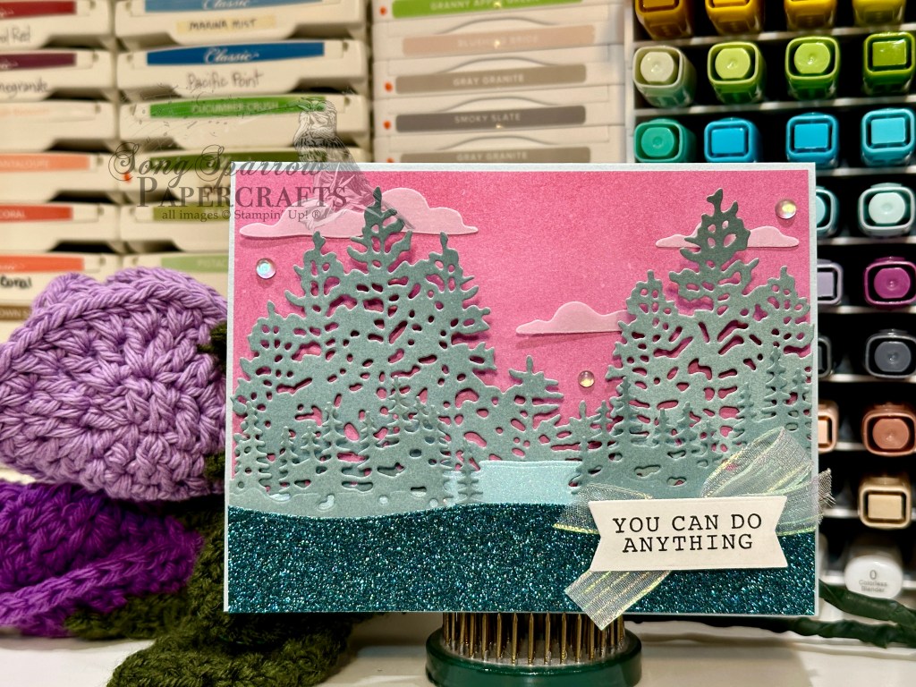 We get started with a base of Cloud Burst cardstock. It provides a nice neutral that lends itself well to the sunrise. I chose a sheet of the pink-hued Lights of Aurora paper to serve as the backdrop for the rest of the scene. The larger tree die in the Light & Wonder die set makes the perfect line of trees in the background. Can’t you just picture a towering stand of cypress back there? I also used the smaller line of trees to help give realistic layers to our scene. Both lines of trees are cut from the green-hued sheet of Lights of Aurora paper. I wanted to give the illusion of a large lake with a smaller inlet in between the trees. So I used two different shades of blue glimmer paper to give the effect of different depths of water. The deeper water is a sheet of Pretty Peacock glimmer paper (sadly retired but still in my stash of faves), while the shallow inlet is a sheet of blue pastel ombre paper. I used the Light & Wonder dies to cut both bodies of water. Dimensionals give some depth to the scene by raising the elements in the foreground. The sentiment from More Messages is stamped in black on white cardstock and adhered over a faux bow of iridescent striped ribbon using dimensionals. The clouds are diecut from vellum and tucked high in the sky behind the trees. A few frosted iridescent dots give the twinkle of the last remaining stars in the dawning sky.
