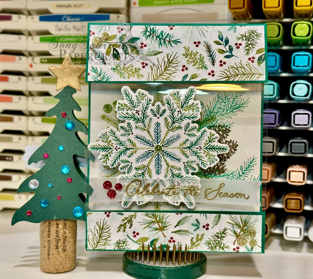 So we get started with a base of Shaded Spruce cardstock. The center section has been removed to insert the window sheet section. Each side of the front panel cardstock pieces are covered with the evergreen patterned sheet from the Elegant Pine Snowflakes paper pack. The snowflake is cut from another sheet and then adhered on the window section. The sentiment from the Delicate Pines stamp set is stamped in Versamark and then heat embossed with gold embossing powder on vellum. The panel is then cut with one of the smaller banner dies from the Stylish Shapes set using the extension method. It’s adhered with tear-n-tape over the snowflake.
