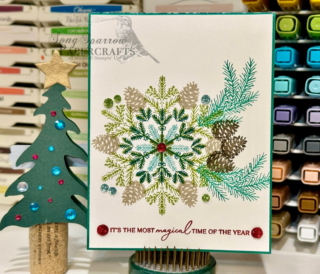 The inside panel of the card begins with white cardstock. I used the window sheet as a stamping block, which made lining up the images a 100% guarantee. I started layering with the largest snowflake from the Delicate Pines stamp set then the middle-sized snowflake image, and then the feather flake. The pinecones are stamped in the negative space of the snowflake in Crumb Cake. I wanted a bit of detail peeking through when the card is closed and so I stamped a group of pinecones in Early Espresso and then surrounded them on either side with pine branches stamped in Shaded Spruce. The sentiment from the same Delicate Pines set is stamped in Real Red in the bottom-center of the panel. Both the inside and outside panels are finished with Traditional Sparkling sequins for the perfect amount of sparkle and pops of contrasting colors.